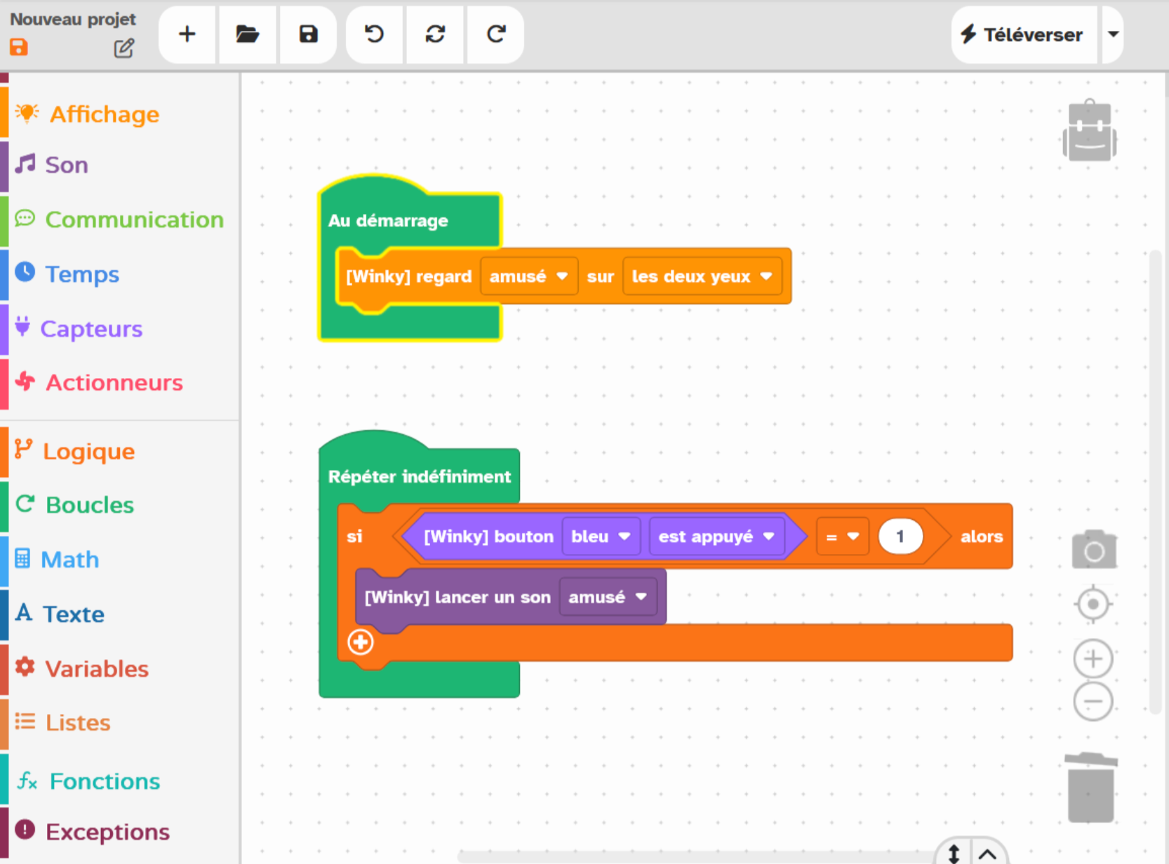 - Usage avec Winky + kit de mobilité : déplacement programmé simple (Blockly)