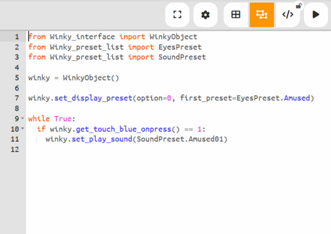 Objectifs scolaires : utilisation de la librairie Python de Winky afin d’exploiter toutes les ressources du robot en réalisant des programmes pas à pas, du plus simple au plus compliqué.
